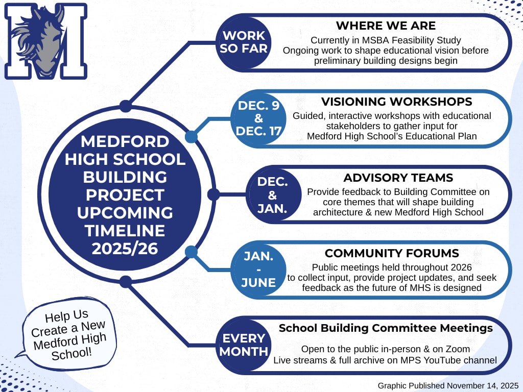 If you’re interested in joining any of these open Advisory teams, please respond to the survey by Monday, December 8. They are part of the upcoming engagement opportunities surrounding the new building project - we hope you’ll join us in shaping this exciting next chapter for Medford High School!